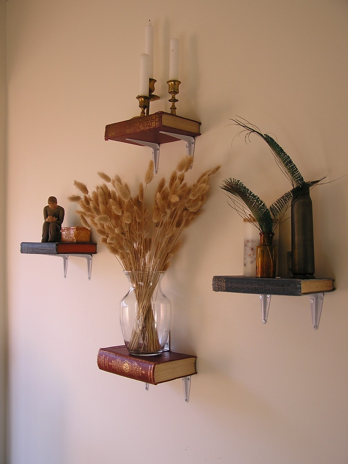 I found the books at Value Village for between $1.99 and $3.99 each, and the brackets came out to about $7.50. I love it when cheap projects turn out so well. To add sentimental value to all that hip shelf-y coolness, one of the books (far left - How to Write and Speak Effective English) is the same book that was re-purposed by Ex Libris Anonymous to become the note book I recorded every detail of our wedding plans in. Cute.