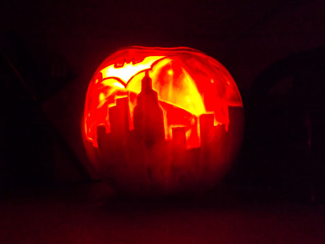 The best part? It's hard to photograph, but you can see it a bit here: the pumpkin casts a batsignal on the wall behind it!!
